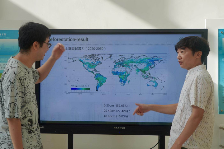覃章才团队通过多年收集全球稀缺土壤数据,成功开发机器学习模型,可以量化造林土壤碳变化,并利用国际合作优势,结合已有植被碳估算,研发出能监测植被和土壤碳变化的“全能检测仪”。团队还通盘考虑国际前沿有关植树造林的环境和社会经济约束,如生物多样性、水资源、地表增温、国家承诺等,从土地的可持续“供给”和国家的政策“需求”两个维度,重新打造了未来森林恢复的“导航地图”。